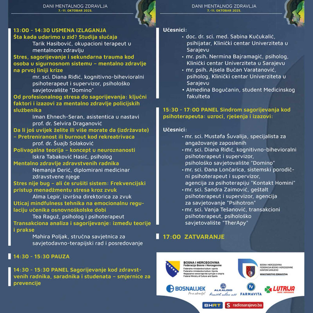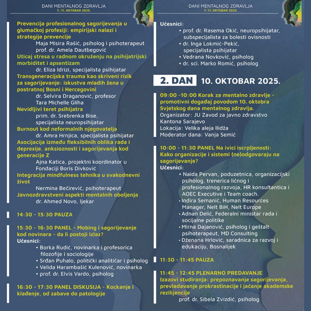 Ovogodišnji fokus je na jednom od najvećih izazova savremenog života – burnout-u. Kroz dva dana predavanja, panel diskusija i razmjene iskustava, otvaramo važne razgovore o uzrocima, posljedicama i mogućim rješenjima sagorijevanja u različitim kontekstima: na poslu, u obrazovanju, zdravstvu i svakodnevici.